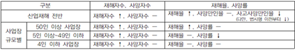 □ 그 결과 ①산업재해 감소 여부에 있어 입법 3년이 지난 현재 시점까지 산업재해 전반, 그리고 사업장 규모별(50인 이상, 5인 이상~49인 미만, 4인 이하)로 재해자수는 여전히 늘고 있으며, 사망자수는 변함이 없는 것으로 나타났다.