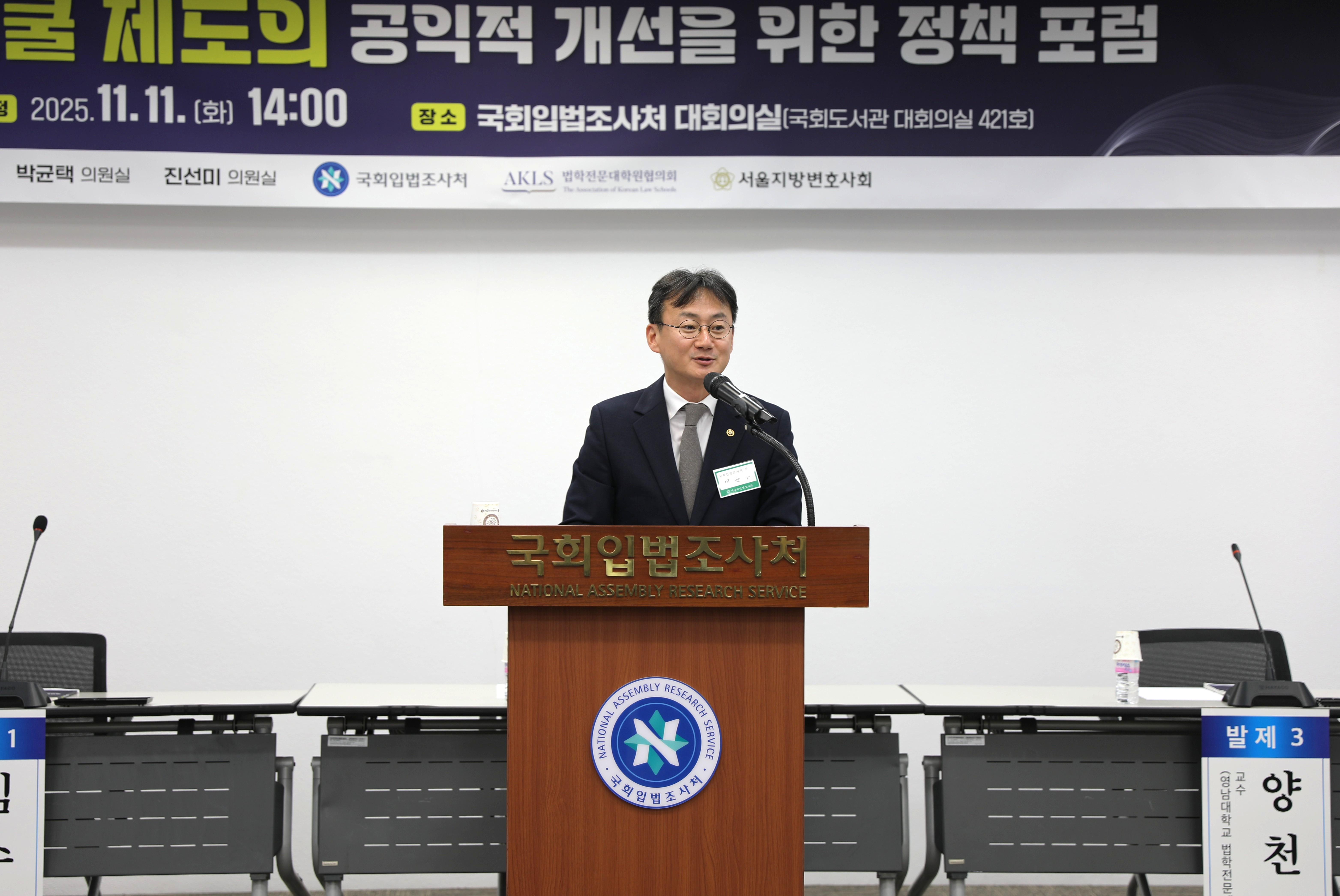 국회입법조사처 이관후 처장은 11월 11일(화) 국회입법조사처 대회의실에서 진행된 로스쿨 제도의 공익적 개선을 위한 정책 포럼에 참석하였다.