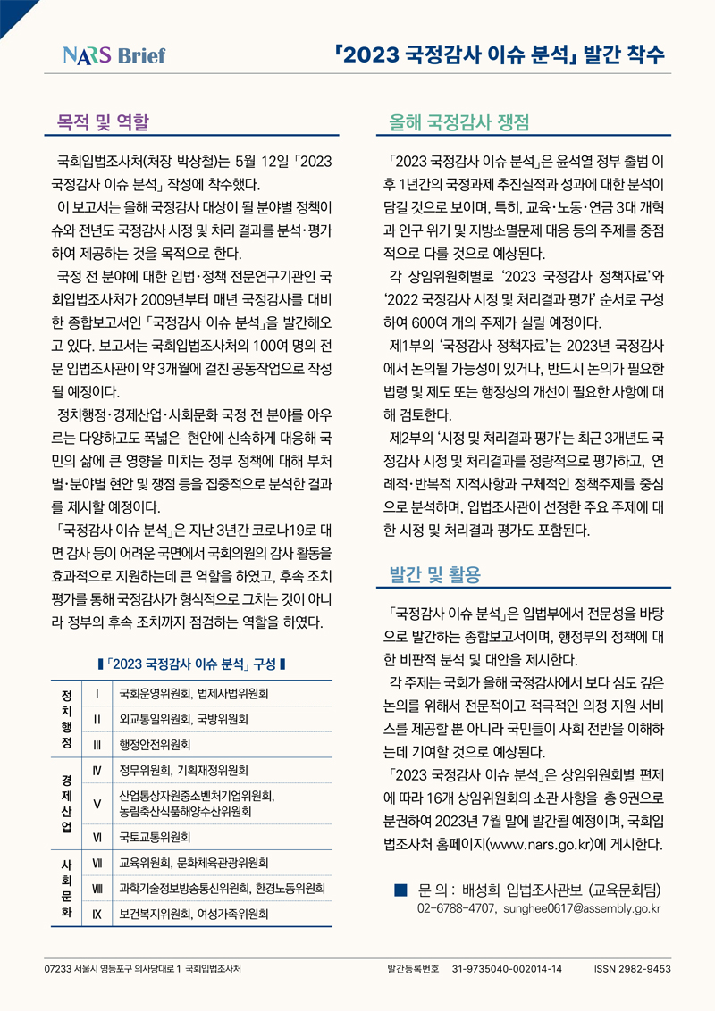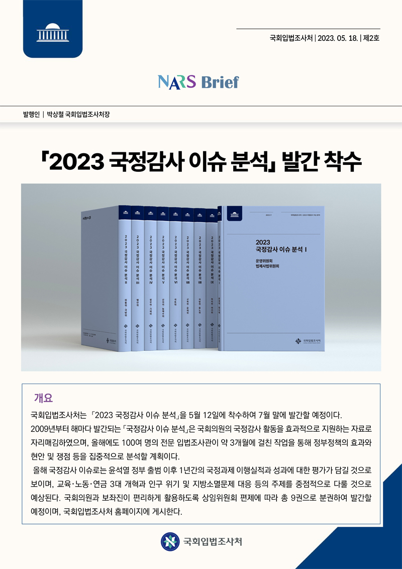 국회입법조사처는 「2023 국정감사 이슈 분석」을 5월 12일에 착수하여 7월 말에 발간할 예정이다.