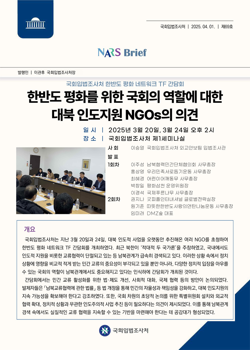 국회입법조사처는 지난 3월 20일과 24일, 대북 인도적 사업을 오랫동안 추진해온 여러 NGO를 초청하여 한반도 평화 네트워크 TF 간담회를 개최하였다. 최근 북한이 ‘적대적 두 국가론’을 주창하였고, 국내에서도 인도적 지원을 비롯한 교류협력이 단절되고 있는 등 남북관계가 급속히 경색되고 있다. 이러한 상황 속에서 정치 상황에 영향을 비교적 적게 받는 민간 교류의 중요성이 부각되고 있을 뿐만 아니라, 다양한 정치적 입장을 아우를 수 있는 국회의 역할이 남북관계에서도 중요해지고 있다는 인식하에 간담회가 개최된 것이다.