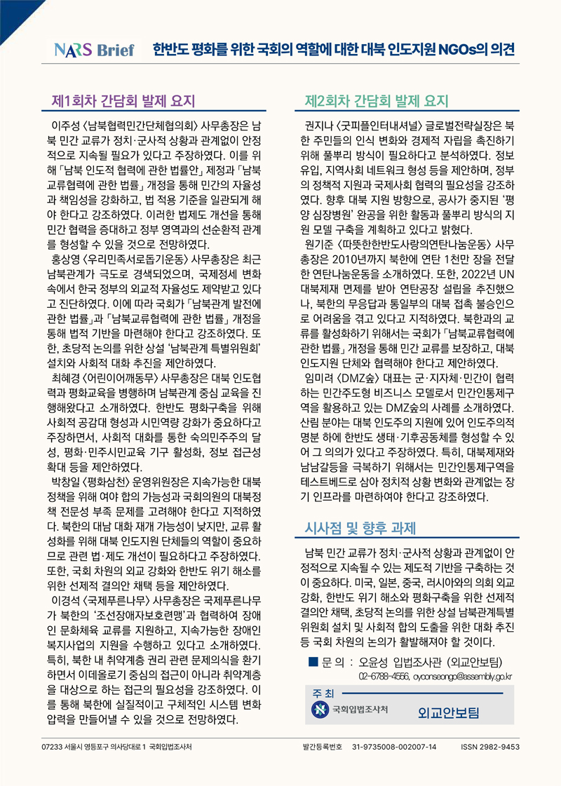 한반도 평화를 위한 국회의 역할에 대한 대북 인도지원 NGOs의 의견
