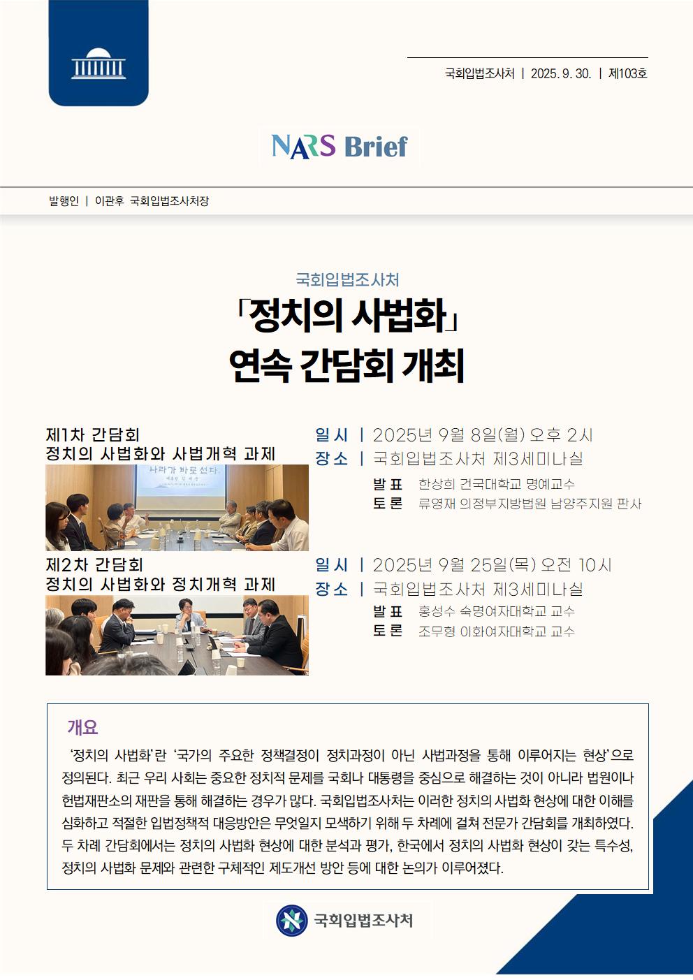 ‘정치의 사법화’란 ‘국가의 주요한 정책결정이 정치과정이 아닌 사법과정을 통해 이루어지는 현상’으로 정의된다. 최근 우리 사회는 중요한 정치적 문제를 국회나 대통령을 중심으로 해결하는 것이 아니라 법원이나 헌법재판소의 재판을 통해 해결하는 경우가 많다. 국회입법조사처는 이러한 정치의 사법화 현상에 대한 이해를 심화하고 적절한 입법정책적 대응방안은 무엇일지 모색하기 위해 두 차례에 걸쳐 전문가 간담회를 개최하였다. 두 차례 간담회에서는 정치의 사법화 현상에 대한 분석과 평가, 한국에서 정치의 사법화 현상이 갖는 특수성, 정치의 사법화 문제와 관련한 구체적인 제도개선 방안 등에 대한 논의가 이루어졌다.