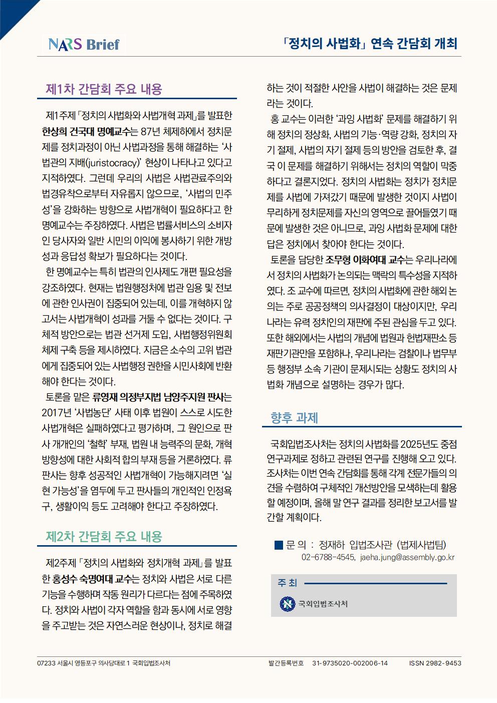 국회입법조사처는 정치의 사법화를 2025년도 중점 연구과제로 정하고 관련된 연구를 진행해 오고 있다. 조사처는 이번 연속 간담회를 통해 각계 전문가들의 의견을 수렴하여 구체적인 개선방안을 모색하는데 활용할 예정이며, 올해 말 연구 결과를 정리한 보고서를 발간할 계획이다.