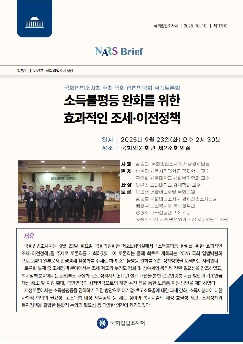 국회입법조사처는 9월 23일 화요일 국회의원회관 제2소회의실에서 「소득불평등 완화를 위한 효과적인 조세·이전정책」을 주제로 토론회를 개최하였다. 이 토론회는 올해 최초로 개최되는 2025 국회 입법박람회 프로그램의 일부로서 민생경제 활성화를 주제로 하여 소득불평등 완화를 위한 정책방향을 모색하는 자리였다.