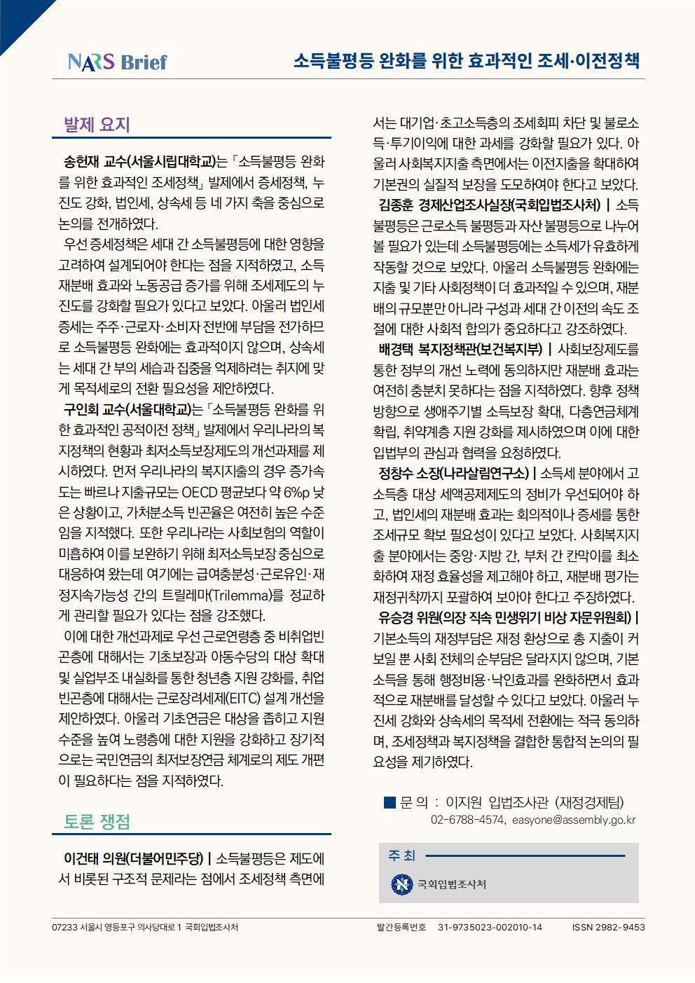 토론회 발제 중 조세정책 분야에서는 조세 제도의 누진도 강화 및 상속세의 목적세 전환 필요성을 강조하였고, 복지정책 분야에서는 실업부조 내실화, 근로장려세제(EITC) 설계 개선을 통한 근로연령층 지원 방안과 기초연금 대상 축소 및 지원 확대, 국민연금의 최저연금으로의 개편 추진 등을 통한 노령층 지원 방안을 제안하였다.
