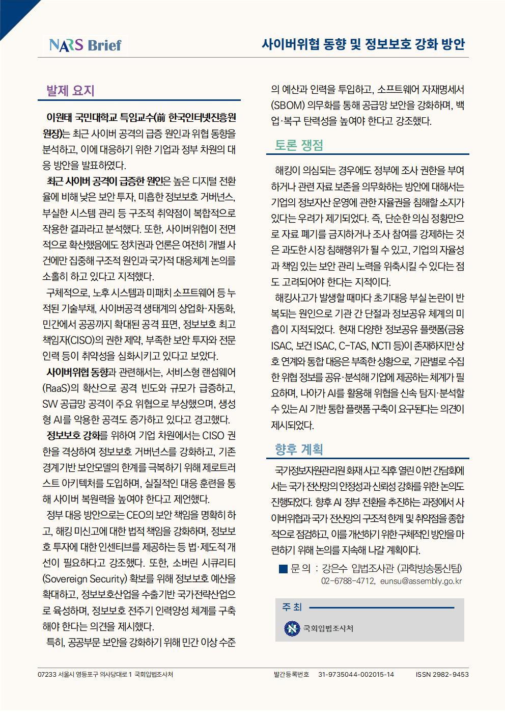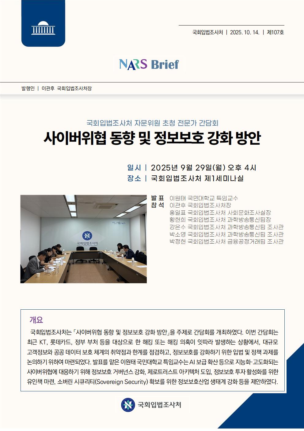 국회입법조사처는 「사이버위협 동향 및 정보보호 강화 방안」을 주제로 간담회를 개최하였다. 이번 간담회는 최근 KT, 롯데카드, 정부 부처 등을 대상으로 한 해킹 또는 해킹 의혹이 잇따라 발생하는 상황에서, 대규모 고객정보와 공공 데이터 보호 체계의 취약점과 한계를 점검하고, 정보보호를 강화하기 위한 입법 및 정책 과제를 논의하기 위하여 마련되었다. 발표를 맡은 이원태 국민대학교 특임교수는 AI 보급 확산 등으로 지능화·고도화되는 사이버위협에 대응하기 위해 정보보호 거버넌스 강화, 제로트러스트 아키텍처 도입, 정보보호 투자 활성화를 위한 유인책 마련, 소버린 시큐리티(Sovereign Security) 확보를 위한 정보보호산업 생태계 강화 등을 제안하였다.