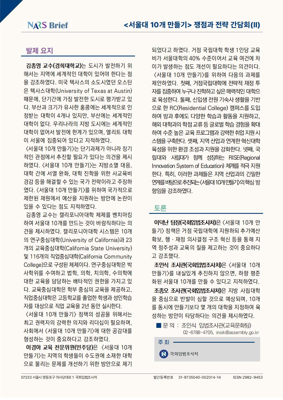 국회입법조사처는 <서울대학교 10개 만들기> 쟁점과 전략에 관한 제2차 간담회를 개최하였다. 교육부는 9월 30일에 <서울대 10개 만들기>와 관련하여 ?국가균형성장을 위한 지방대학 육성방안(안)?을 발표하였다. 김종영 교수(경희대학교 사회학과)는 <서울대 10개 만들기>를 국가 전략 차원에서 장기적인 관점을 가지고 지역혁신정책과 대학구조개혁 정책을 연계하여 대학경쟁력을 강화하는 계기로 삼을 필요가 있다고 주장하였다. 이경아 교육전문위원(민주당)은 <서울대 10개 만들기>는 대학이 지역 산업과 연계해 지역균형성장의 중심축으로 자리잡을 수 있도록 추진되어야 한다는 의견을 제시하였다. 토론자들은 <서울대 10개 만들기>를 사회적 합의에 기반해서 추진할 필요가 있다는 점에 공감하였고, 거점 국립대학 9개에 막대한 예산을 지원하는 방안에 대한 사립대학의 반발도 고려할 필요가 있다는 의견도 제시하였다. 국회입법조사처는 <서울대 10개 만들기>에 관한 세미나 개최와 보고서 발간을 계획하고 있다.