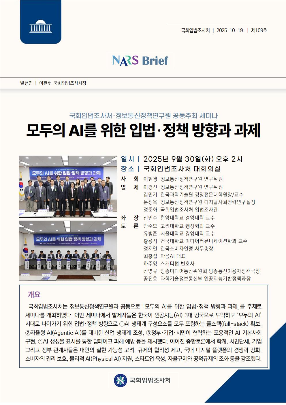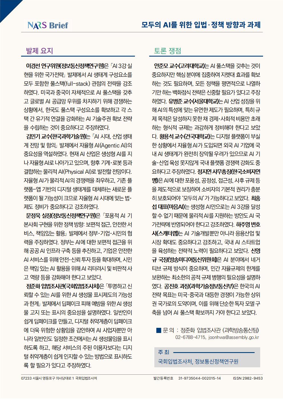 국회입법조사처는 정보통신정책연구원과 공동으로 「모두의 AI를 위한 입법?정책 방향과 과제」를 주제로 세미나를 개최하였다. 이번 세미나에서 발제자들은 한국이 인공지능(AI) 3대 강국으로 도약하고 ‘모두의 AI’ 시대로 나아가기 위한 입법?정책 방향으로 ①AI 생태계 구성요소를 모두 포함하는 풀스택(full-stack) 확보, ②자율형 AI(Agentic AI)를 대비한 산업 생태계 조성, ③정부?기업?시민이 협력하는 포용적인 AI 기본사회 구현, ④AI 생성물 표시를 통한 딥페이크 피해 예방 등을 제시했다. 이어진 종합토론에서 학계, 시민단체, 기업 그리고 정부 관계자들은 대안의 실현 가능성 고려, 규제의 합리성 제고, 국내 디지털 플랫폼의 경쟁력 강화, 소비자의 권리 보호, 물리적 AI(Physical AI) 지원, 스타트업 육성, 자율규제와 공적규제의 조화 등을 강조했다.