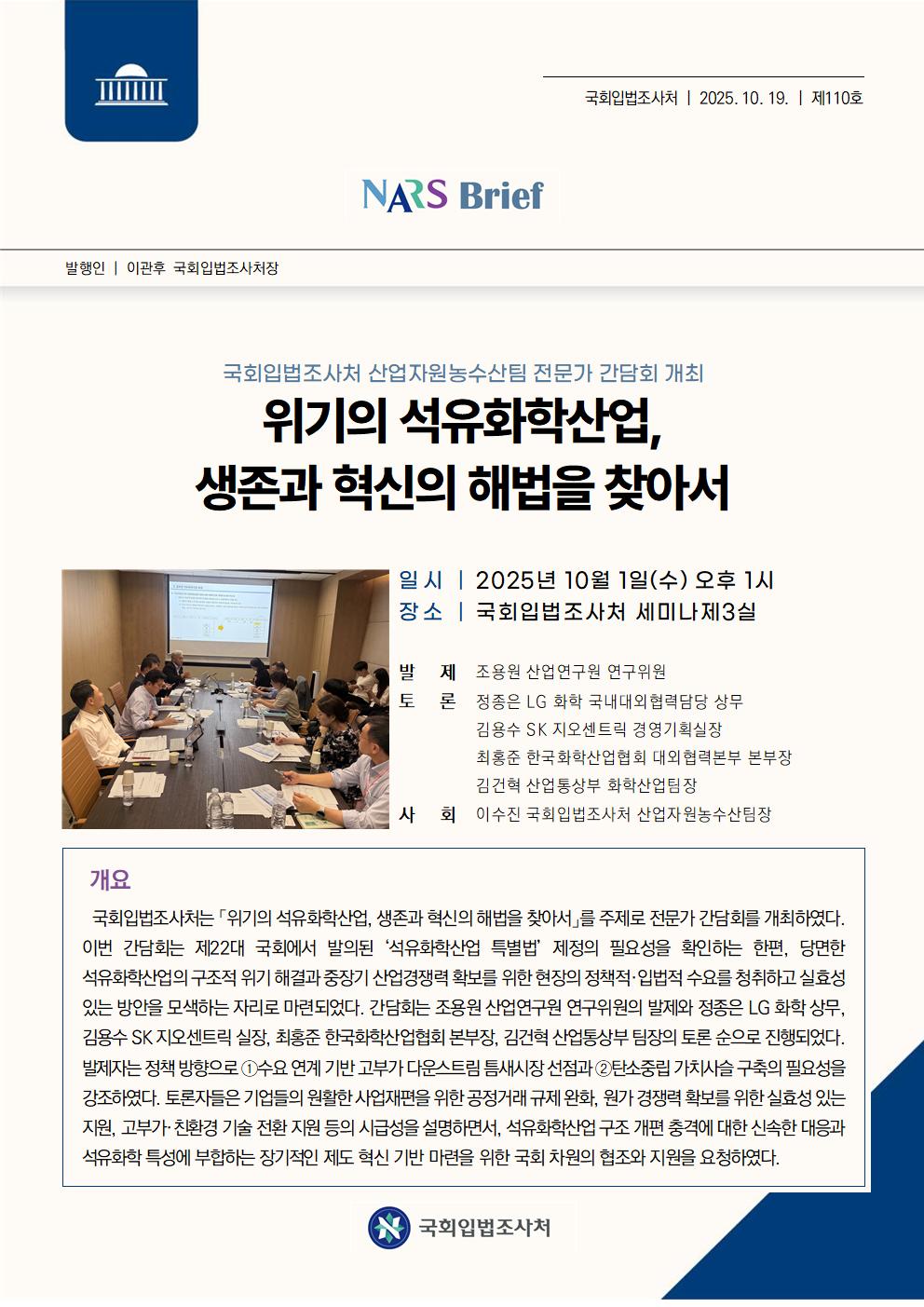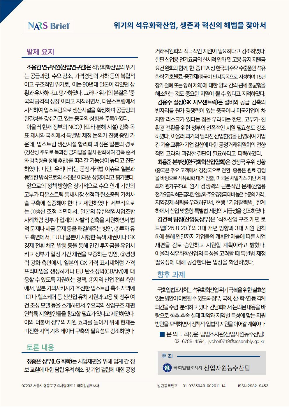 국회입법조사처는 「위기의 석유화학산업, 생존과 혁신의 해법을 찾아서」를 주제로 전문가 간담회를 개최하였다. 이번 간담회는 제22대 국회에서 발의된 ‘석유화학산업 특별법’ 제정의 필요성을 확인하는 한편, 당면한 석유화학산업의 구조적 위기 해결과 중장기 산업경쟁력 확보를 위한 현장의 정책적·입법적 수요를 청취하고 실효성 있는 방안을 모색하는 자리로 마련되었다. 간담회는 조용원 산업연구원 연구위원의 발제와 정종은 LG 화학 상무, 김용수 SK 지오센트릭 실장, 최홍준 한국화학산업협회 본부장, 김건혁 산업통상부 팀장의 토론 순으로 진행되었다. 발제자는 정책 방향으로 ①수요 연계 기반 고부가 다운스트림 틈새시장 선점과 ②탄소중립 가치사슬 구축의 필요성을 강조하였다. 토론자들은 기업들의 원활한 사업재편을 위한 공정거래 규제 완화, 원가 경쟁력 확보를 위한 실효성 있는 지원, 고부가·친환경 기술 전환 지원 등의 시급성을 설명하면서, 석유화학산업 구조 개편 충격에 대한 신속한 대응과 석유화학 특성에 부합하는 장기적인 제도 혁신 기반 마련을 위한 국회 차원의 협조와 지원을 요청하였다.