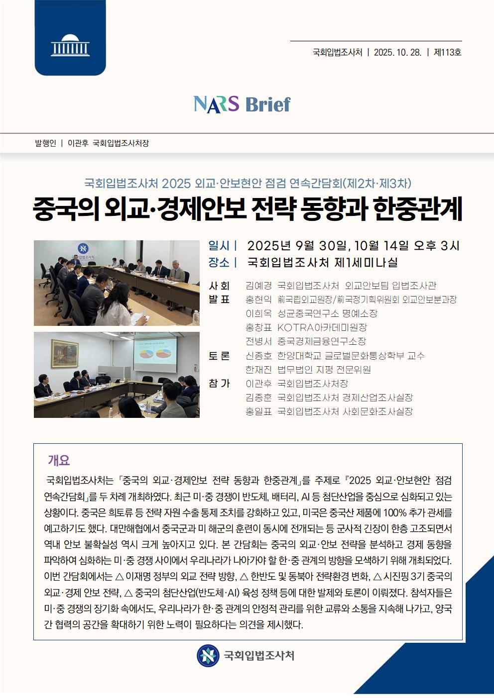 국회입법조사처는 「중국의 외교·경제안보 전략 동향과 한중관계」를 주제로 『2025 외교·안보현안 점검 연속간담회」를 두 차례 개최하였다. 최근 미·중 경쟁이 반도체, 배터리, AI 등 첨단산업을 중심으로 심화되고 있는 상황이다. 중국은 희토류 등 전략 자원 수출 통제 조치를 강화하고 있고, 미국은 중국산 제품에 100% 추가 관세를 예고하기도 했다. 대만해협에서 중국군과 미 해군의 훈련이 동시에 전개되는 등 군사적 긴장이 한층 고조되면서 역내 안보 불확실성 역시 크게 높아지고 있다. 본 간담회는 중국의 외교·안보 전략을 분석하고 경제 동향을 파악하여 심화하는 미·중 경쟁 사이에서 우리나라가 나아가야 할 한·중 관계의 방향을 모색하기 위해 개최되었다. 이번 간담회에서는 △ 이재명 정부의 외교 전략 방향, △ 한반도 및 동북아 전략환경 변화, △ 시진핑 3기 중국의 외교·경제 안보 전략, △ 중국의 첨단산업(반도체·AI) 육성 정책 등에 대한 발제와 토론이 이뤄졌다. 참석자들은 미·중 경쟁의 장기화 속에서도, 우리나라가 한·중 관계의 안정적 관리를 위한 교류와 소통을 지속해 나가고, 양국 간 협력의 공간을 확대하기 위한 노력이 필요하다는 의견을 제시했다.