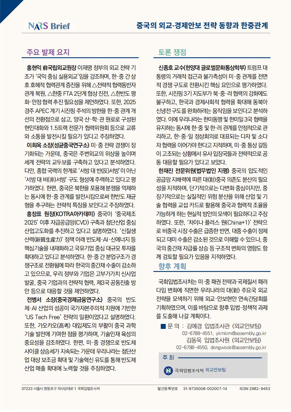 국회입법조사처 2025 외교·안보현안 점검 연속간담회(제2차·제3차) 중국의 외교·경제안보 전략 동향과 한중관계