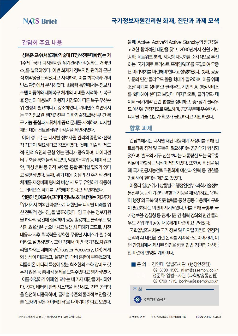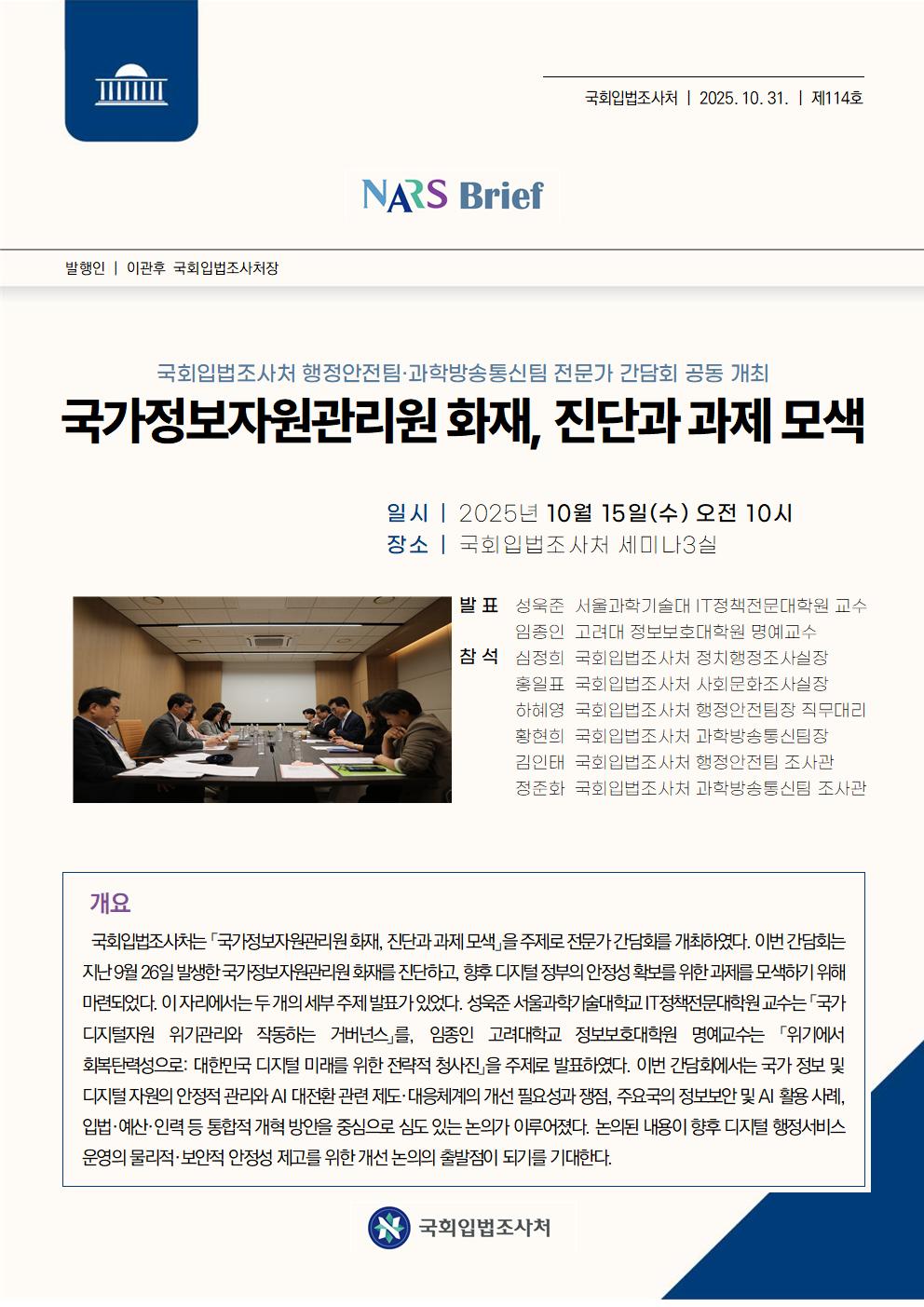 국회입법조사처는 「국가정보자원관리원 화재, 진단과 과제 모색」을 주제로 전문가 간담회를 개최하였다. 이번 간담회는 지난 9월 26일 발생한 국가정보자원관리원 화재를 진단하고, 향후 디지털 정부의 안정성 확보를 위한 과제를 모색하기 위해 마련되었다. 이 자리에서는 두 개의 세부 주제 발표가 있었다. 성욱준 서울과학기술대학교 IT정책전문대학원 교수는 「국가 디지털자원 위기관리와 작동하는 거버넌스」를, 임종인 고려대학교 정보보호대학원 명예교수는 「위기에서 회복탄력성으로: 대한민국 디지털 미래를 위한 전략적 청사진」을 주제로 발표하였다. 이번 간담회에서는 국가 정보 및 디지털 자원의 안정적 관리와 AI 대전환 관련 제도·대응체계의 개선 필요성과 쟁점, 주요국의 정보보안 및 AI 활용 사례, 입법·예산·인력 등 통합적 개혁 방안을 중심으로 심도 있는 논의가 이루어졌다. 논의된 내용이 향후 디지털 행정서비스 운영의 물리적·보안적 안정성 제고를 위한 개선 논의의 출발점이 되기를 기대한다.