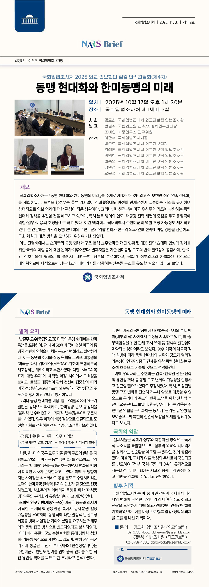 국회입법조사처는 「동맹 현대화와 한미동맹의 미래」를 주제로 제4차 『2025 외교·안보현안 점검 연속간담회』 를 개최하였다. 트럼프 행정부는 출범 200일이 경과했음에도 여전히 관세전선에 집중하는 기조를 유지하며 상대적으로 안보 의제에 대한 관심이 적은 상황이다. 그러나, 미 전쟁부는 미국 우선주의 기조에 부합하는 동맹 현대화 정책을 추진할 것을 예고하고 있으며, 특히 본토 방어와 인도-태평양 전략 재편에 중점을 두고 동맹국에 역할·임무·비용의 조정을 요구하고 있다. 이런 맥락에서 국내외에서 주한미군의 역할 조정 가능성도 제기되고 있다. 본 간담회는 미국의 동맹 현대화와 주한미군의 역할 변화가 한국의 외교·안보 전략에 미칠 영향을 점검하고, 국회 차원의 대응 방향을 모색하기 위하여 개최되었다. 이번 간담회에서는 △미국의 동맹 현대화 구조 분석 △주한미군 재편 현황 및 대응 전략 △대미 협상력 강화를 위한 국회의 역할 등에 대한 논의가 이루어졌다. 발제자들은 기존 한미동맹 구조의 변화 필요성에 공감하며, 한·미 간 상호주의적 협력의 틀 속에서 ‘대칭동맹’ 담론을 본격화하고, 국회가 정부외교와 차별화된 방식으로 대의회외교에 나섬으로써 정부외교의 레버리지를 강화하는 선순환 구조를 유도할 필요가 있다고 보았다