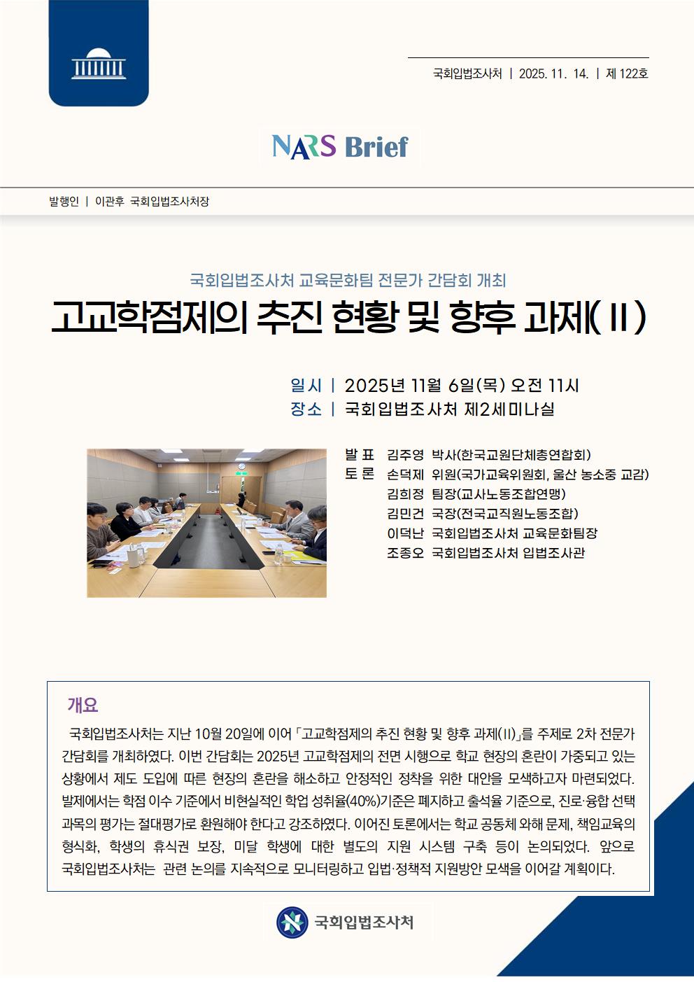 국회입법조사처는 지난 10월 20일에 이어 「고교학점제의 추진 현황 및 향후 과제(Ⅱ)」를 주제로 2차 전문가 간담회를 개최하였다. 이번 간담회는 2025년 고교학점제의 전면 시행으로 학교 현장의 혼란이 가중되고 있는 상황에서 제도 도입에 따른 현장의 혼란을 해소하고 안정적인 정착을 위한 대안을 모색하고자 마련되었다. 발제에서는 학점 이수 기준에서 비현실적인 학업 성취율(40%)기준은 폐지하고 출석율 기준으로, 진로·융합 선택 과목의 평가는 절대평가로 환원해야 한다고 강조하였다. 이어진 토론에서는 학교 공동체 와해 문제, 책임교육의 형식화, 학생의 휴식권 보장, 미달 학생에 대한 별도의 지원 시스템 구축 등이 논의되었다. 앞으로 국회입법조사처는 관련 논의를 지속적으로 모니터링하고 입법·정책적 지원방안 모색을 이어갈 계획이다.