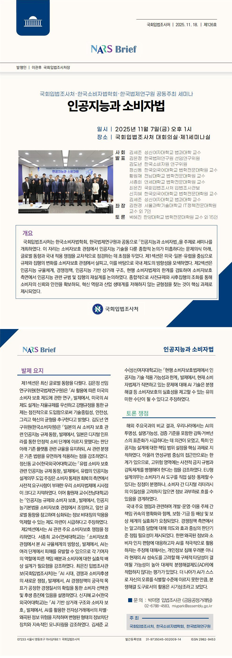국회입법조사처는 한국소비자법학회, 한국법제연구원과 공동으로 「인공지능과 소비자법」을 주제로 세미나를 개최하였다. 이 자리는 소비자보호 관점에서 인공지능 기술을 다룬 종합적 논의가 미흡하다는 문제의식 아래, 글로벌 동향과 국내 적용 쟁점을 교차적으로 점검하는 데 초점을 두었다. 제1섹션은 미국·일본·유럽을 중심으로 규제와 집행의 변화를 소비자보호 관점에서 살피고, 이를 바탕으로 국내 제도의 방향성을 모색하였다. 제2섹션은 인공지능 규율체계, 경쟁정책, 인공지능 기반 상거래 구조, 현행 소비자법제의 한계를 검토하여 소비자보호 측면에서 인공지능 관련 규범 및 집행의 재설계를 논의하였다. 종합적으로 사전규제와 사후집행의 조화를 통해 소비자의 신뢰와 안전을 확보하되, 혁신 역량과 산업 생태계를 저해하지 않는 균형점을 찾는 것이 핵심 과제로 제시되었다.