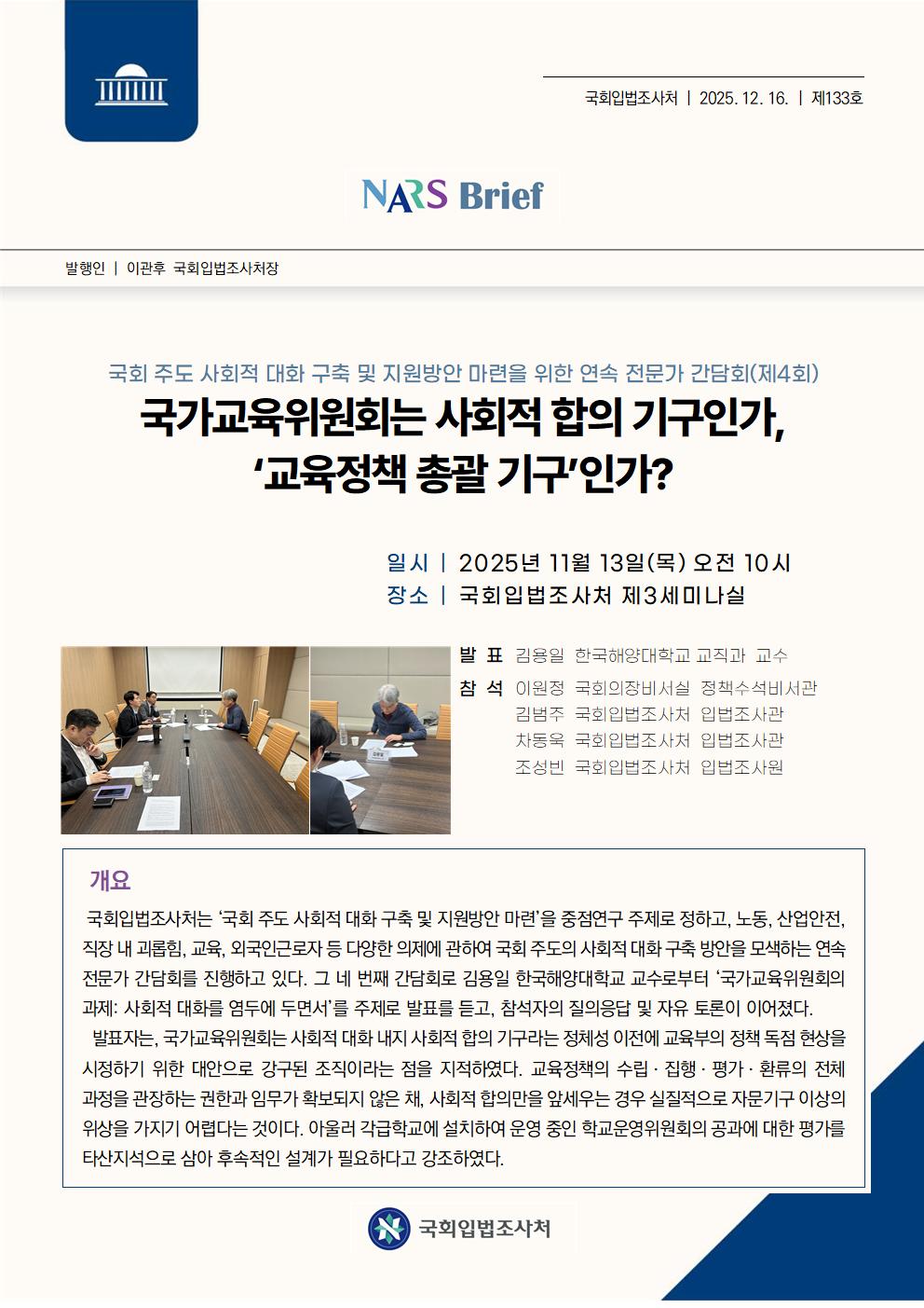국회입법조사처는 ‘국회 주도 사회적 대화 구축 및 지원방안 마련’을 중점연구 주제로 정하고, 노동, 산업안전, 직장 내 괴롭힘, 교육, 외국인근로자 등 다양한 의제에 관하여 국회 주도의 사회적 대화 구축 방안을 모색하는 연속 전문가 간담회를 진행하고 있다. 그 네 번째 간담회로 김용일 한국해양대학교 교수로부터 ‘국가교육위원회의 과제: 사회적 대화를 염두에 두면서’를 주제로 발표를 듣고, 참석자의 질의응답 및 자유 토론이 이어졌다.