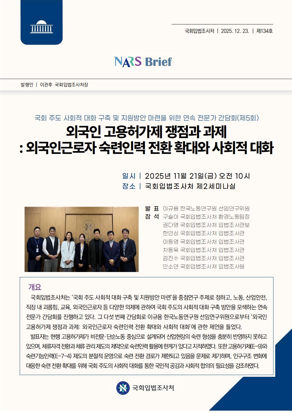 국회입법조사처는 ‘국회 주도 사회적 대화 구축 및 지원방안 마련’을 중점연구 주제로 정하고, 노동, 산업안전, 직장 내 괴롭힘, 교육, 외국인근로자 등 다양한 의제에 관하여 국회 주도의 사회적 대화 구축 방안을 모색하는 연속 전문가 간담회를 진행하고 있다. 그 다섯 번째 간담회로 이규용 한국노동연구원 선임연구위원으로부터 ‘외국인 고용허가제 쟁점과 과제: 외국인근로자 숙련인력 전환 확대와 사회적 대화’에 관한 제언을 들었다. 발표자는 현행 고용허가제가 비전문·단순노동 중심으로 설계되어 산업현장의 숙련 형성을 충분히 반영하지 못하고 있으며, 체류자격 전환과 체류 관리 제도의 제약으로 숙련인력 활용에 한계가 있다고 지적하였다. 또한 고용허가제(E-9)와 숙련기능인력(E-7-4) 제도의 분절적 운영으로 숙련 전환 경로가 제한되고 있음을 문제로 제기하며, 인구구조 변화에 대응한 숙련 전환 확대를 위해 국회 주도의 사회적 대화를 통한 국민적 공감과 사회적 합의의 필요성을 강조하였다.