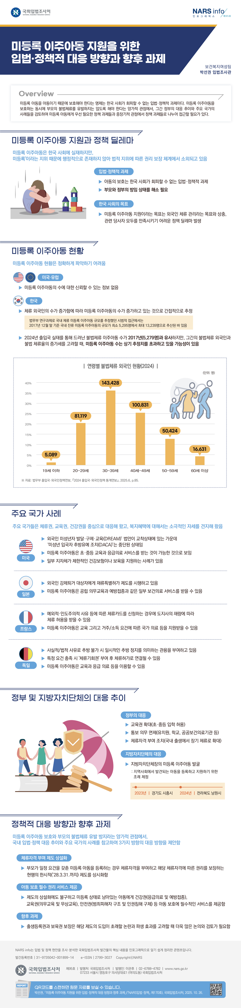 미등록 아동을 아동이기 때문에 보호해야 한다는 명제는 한국 사회가 회피할 수 없는 입법?정책적 과제이다. 미등록 이주아동을 보호하는 동시에 부모의 불법체류를 유발하지는 않도록 해야 한다는 양가적 관점에서, 그간 정부의 대응 추이와 주요 국가의 사례들을 검토하여 미등록 아동에게 우선 필요한 정책 과제들과 중장기적 관점에서 정책 과제들로 나누어 접근할 필요가 있다.