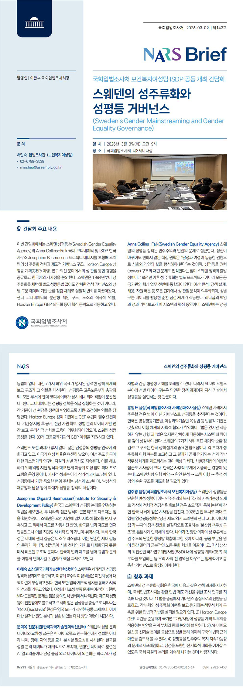 김주경 팀장(국회입법조사처 보건복지여성팀) 스웨덴이 성평등을 단순한 여성 정책이 아닌 민주주의와 복지 국가의 지속가능성 의제로 격상해 정치적 정당성을 확보한 점은 소모적인 ‘특혜 논란’에 갇힌 한국 사회에 깊은 시사점을 던진다. 2026년 전 부처로 확대 도입될 양성평등정책담당관 제도 역시 스웨덴의 젠더 코디네이터처럼 각 부처의 정책 전반을 실질적으로 조율하는 ‘분산형 책무성 구조’로 튼튼하게 안착해야 한다. 나아가 진정한 의미의 성 주류화는 관 주도의 단순한 행정망 확충에 그칠 것이 아니라, 공공 부문을 넘어 민간 일터의 근본적인 노동 문화 혁신을 이끌어내고, 지식 생산의 최전선인 국가연구개발사업(R&D) 내에 성평등 계획(GEP) 의무화를 도입하는 등 우리 사회 전 영역을 아우르는 입체적이고 촘촘한 거버넌스로 확장되어야 한다.