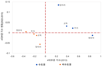 [그림 1] 수도권과 비수도권 4대 부문 지수 변화(2013년 대비 2022년)