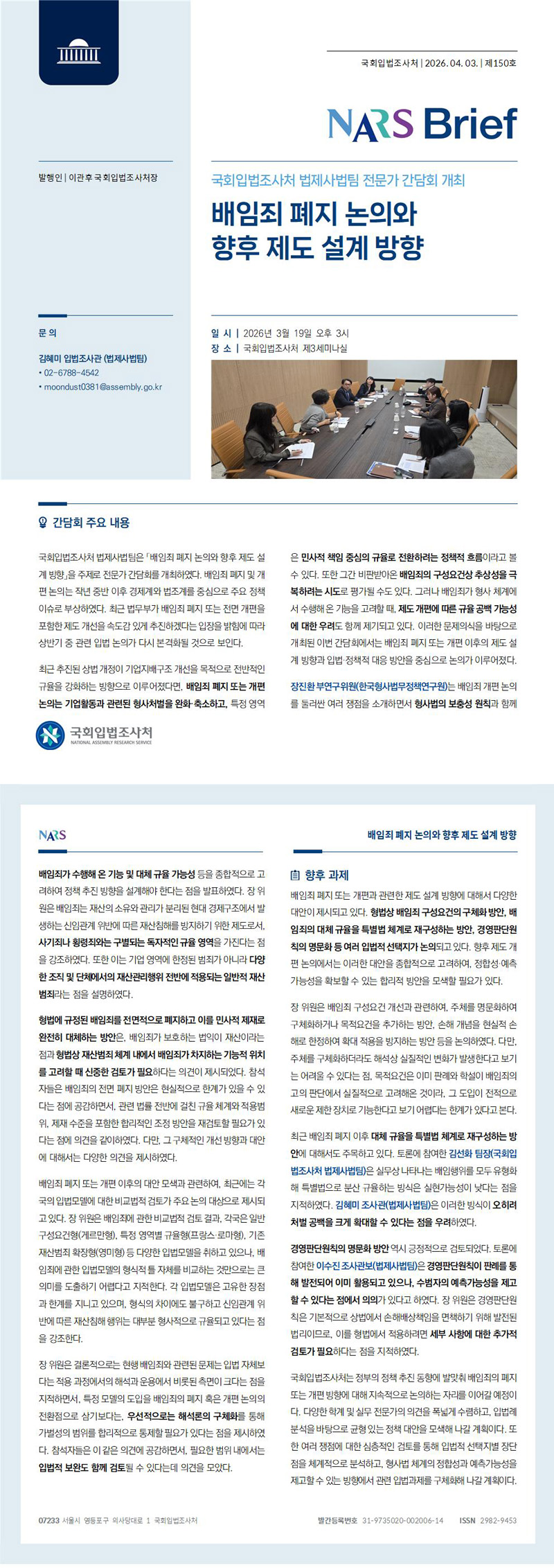 국회입법조사처 법제사법팀은 「배임죄 폐지 논의와 향후 제도 설계 방향」을 주제로 전문가 간담회를 개최하였다. 배임죄 폐지 및 개편 논의는 작년 중반 이후 경제계와 법조계를 중심으로 주요 정책 이슈로 부상하였다. 최근 법무부가 배임죄 폐지 또는 전면 개편을 포함한 제도 개선을 속도감 있게 추진하겠다는 입장을 밝힘에 따라 상반기 중 관련 입법 논의가 다시 본격화될 것으로 보인다.