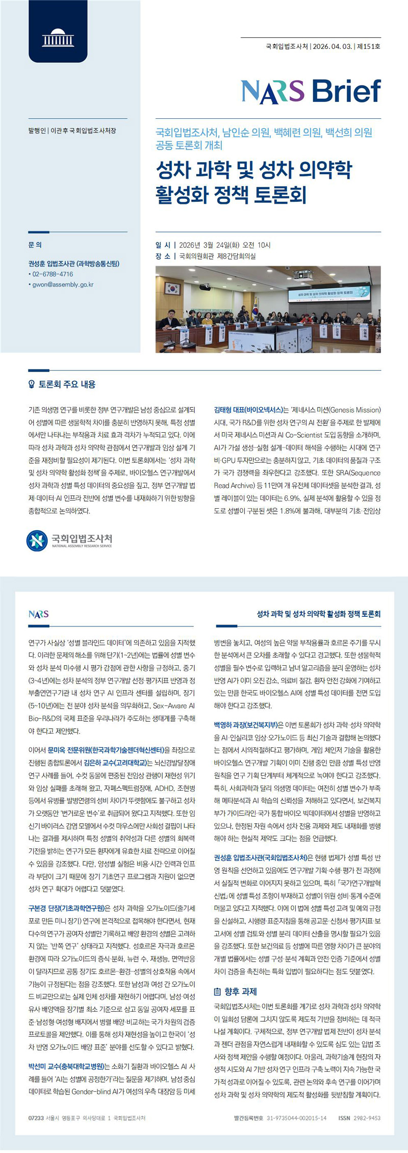 국회입법조사처는 이번 토론회를 계기로 성차 과학과 성차 의약학이 일회성 담론에 그치지 않도록 제도적 기반을 정비하는 데 적극 나설 계획이다. 구체적으로, 정부 연구개발 법제 전반이 성차 분석과 젠더 관점을 자연스럽게 내재화할 수 있도록 심도 있는 입법 조사와 정책 제안을 수행할 예정이다. 아울러, 과학기술계 현장의 자생적 시도와 AI 기반 성차 연구 인프라 구축 노력이 지속 가능한 국가적 성과로 이어질 수 있도록, 관련 논의와 후속 연구를 이어가며 성차 과학 및 성차 의약학의 제도적 활성화를 뒷받침할 계획이다.