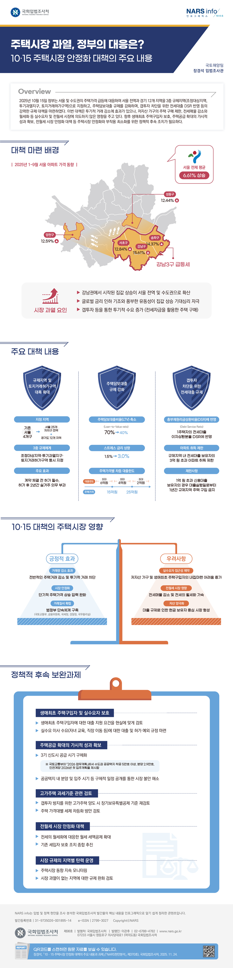 2025년 10월 15일 정부는 서울 및 수도권의 주택가격 급등에 대응하여 서울 전역과 경기 12개 지역을 3중 규제지역(조정대상지역, 투기과열지구, 토지거래허가구역)으로 지정하고, 주택담보대출 규제를 강화하며, 갭투자 차단을 위한 전세대출 DSR 반영 등의 강력한 규제 대책을 마련하였다. 이번 대책은 투기적 거래 감소에 효과가 있으나, 저자산 가구의 주택 구매 제한, 전세매물 감소와 월세화 등 실수요자 및 전월세 시장에 의도하지 않은 영향을 주고 있다. 향후 생애최초 주택구입자 보호, 주택공급 확대의 가시적 성과 확보, 전월세 시장 안정화 대책 등 주택시장 안정화와 부작용 최소화를 위한 정책적 후속 조치가 필요하다.