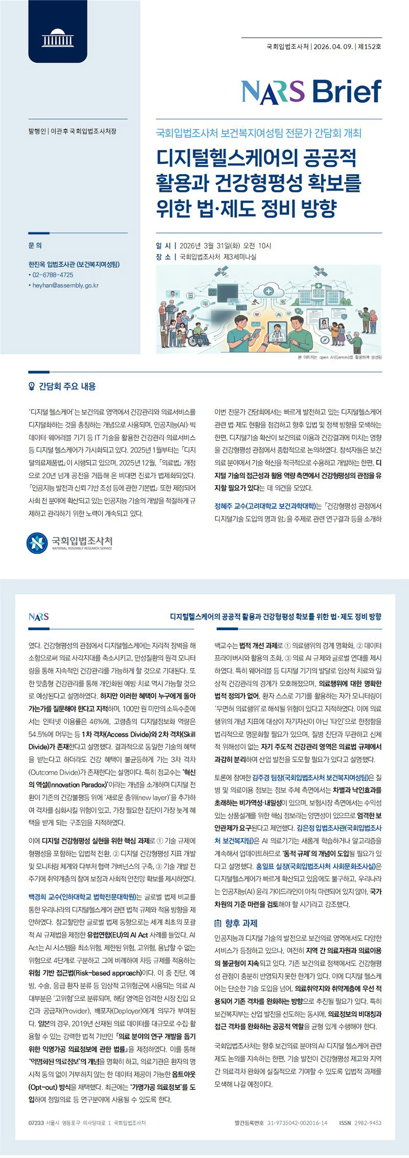 국회입법조사처는 향후 보건의료 분야의 AI·디지털 헬스케어 관련 제도 논의를 지속하는 한편, 기술 발전이 건강형평성 제고와 지역 간 의료격차 완화에 실질적으로 기여할 수 있도록 입법적 과제를 모색해 나갈 예정이다.