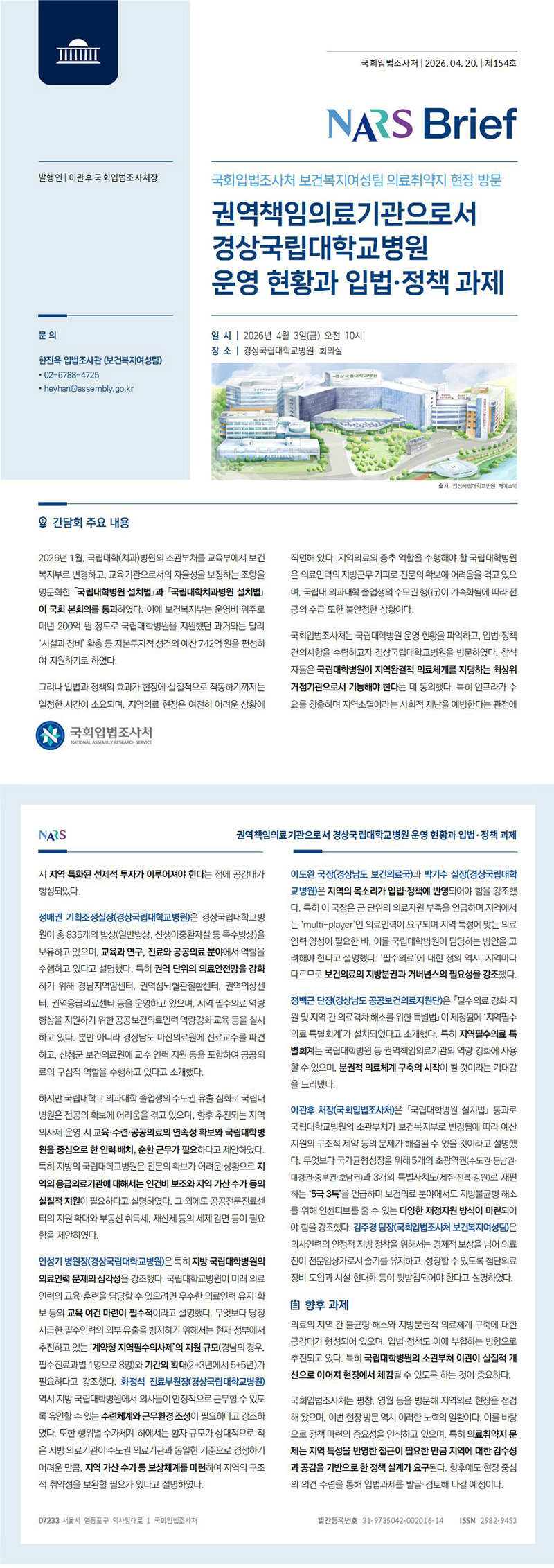 국회입법조사처는 국립대학병원 운영 현황을 파악하고, 입법·정책 건의사항을 수렴하고자 경상국립대학교병원을 방문하였다. 참석자들은 국립대학병원이 지역완결적 의료체계를 지탱하는 최상위 거점기관으로서 기능해야 한다는 데 동의했다. 특히 인프라가 수요를 창출하며 지역소멸이라는 사회적 재난을 예방한다는 관점에서 지역 특화된 선제적 투자가 이루어져야 한다는 점에 공감대가 형성되었다.