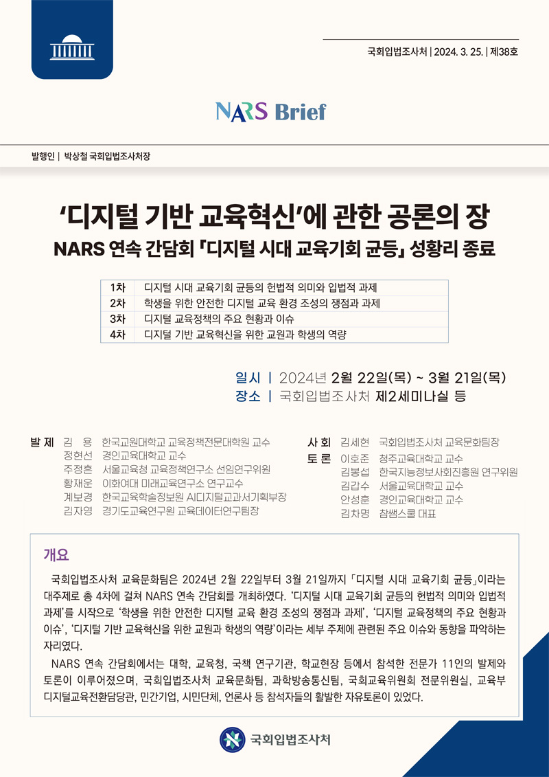 국회입법조사처 교육문화팀은 2024년 2월 22일부터 3월 21일까지 「디지털 시대 교육기회 균등」이라는 대주제로 총 4차에 걸쳐 NARS 연속 간담회를 개최하였다. ‘디지털 시대 교육기회 균등의 헌법적 의미와 입법적 과제’를 시작으로 ‘학생을 위한 안전한 디지털 교육 환경 조성의 쟁점과 과제’, ‘디지털 교육정책의 주요 현황과 이슈’, ‘디지털 기반 교육혁신을 위한 교원과 학생의 역량’이라는 세부 주제에 관련된 주요 이슈와 동향을 파악하는 자리였다.