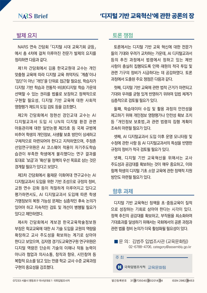 토론에서는 디지털 기반 교육 혁신에 대한 전문가들의 기대와 우려가 교차하는 가운데, AI 디지털교과서 등의 추진 과정에서 법령에서 정하고 있는 제반 사항이 충실히 집행되도록 인력·재원의 적극 투입 및 관련 기구의 정비가 시급하다는 데 공감하였다. 토론 과정에서 도출된 주요 쟁점은 다음과 같다.