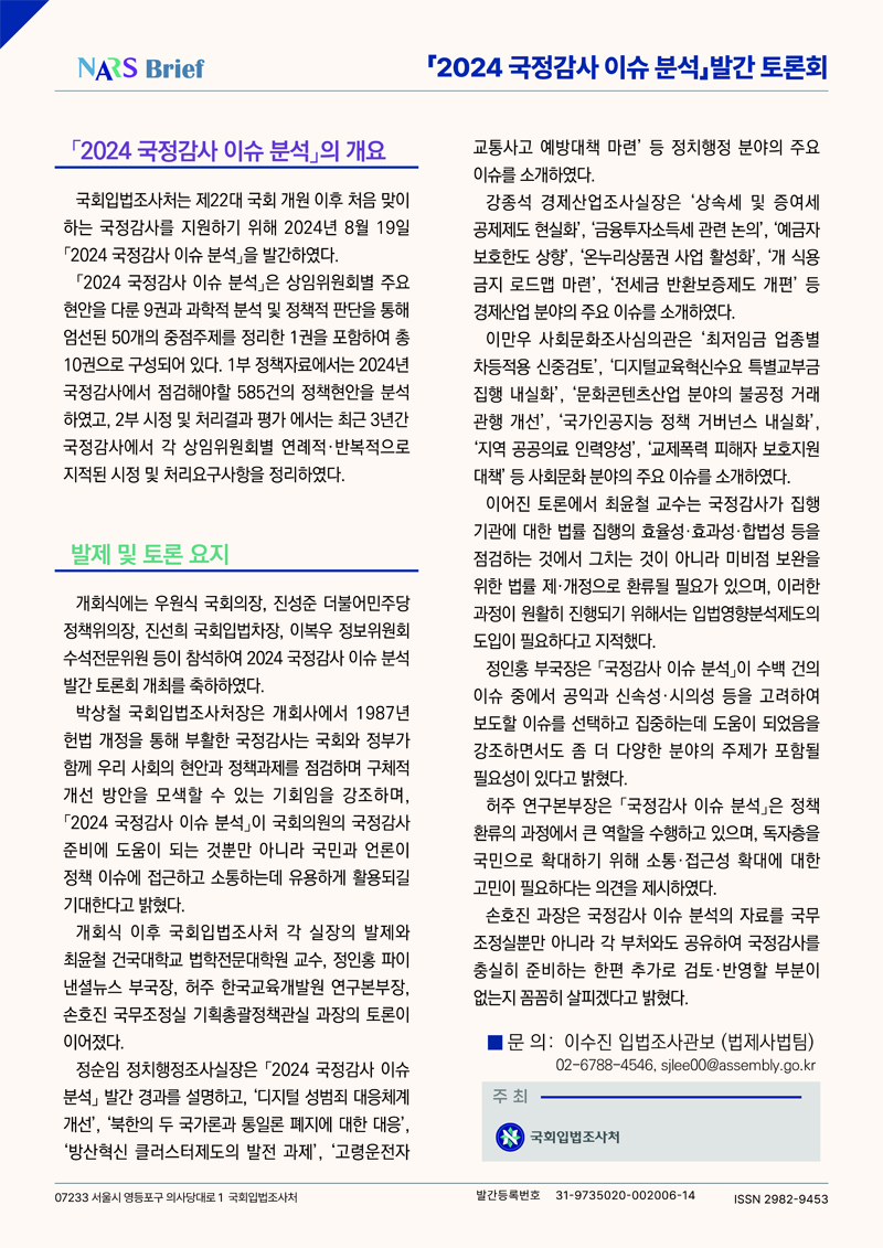 국회입법조사처는 2024년 8월 21일 국회입법조사처 대회의실에서 「2024 국정감사 이슈 분석」 발간 취지를 알리고 2024년 국정감사에서 주요하게 살펴야 할 주제를 소개하는 토론회를 개최하였다. 토론회는 국회입법조사처의 정순임 정치행정조사실장, 강종석 경제산업조사실장, 이만우 사회문화조사심의관이 「2024 국정감사 이슈 분석」의 주요 이슈에 대해 발제하고, 최윤철 건국대학교 법학전문대학원 교수, 정인홍 파이낸셜뉴스 부국장, 허주 한국교육개발원 연구본부장, 손호진 국무조정실 기획총괄정책관실 과장이 토론하는 순서로 진행되었다. 토론자들은 「2024 국정감사 이슈 분석」이 정책환류의 과정에서 중요한 역할을 수행하고 있음에 공감하며, 더 많은 국민과 소통할 수 있도록 접근성을 확대하고 더 다양한 주제를 포괄할 필요성이 있다는 의견을 제시하였다.